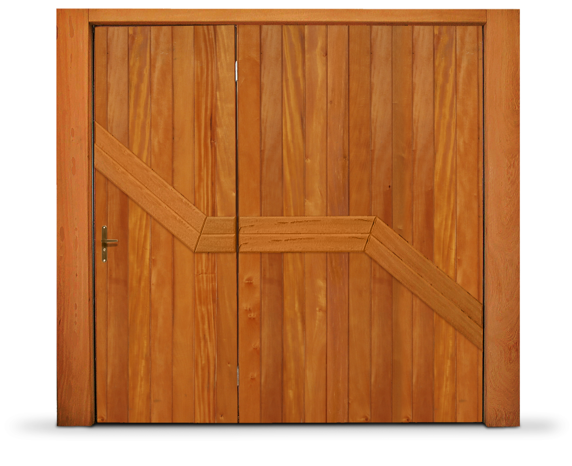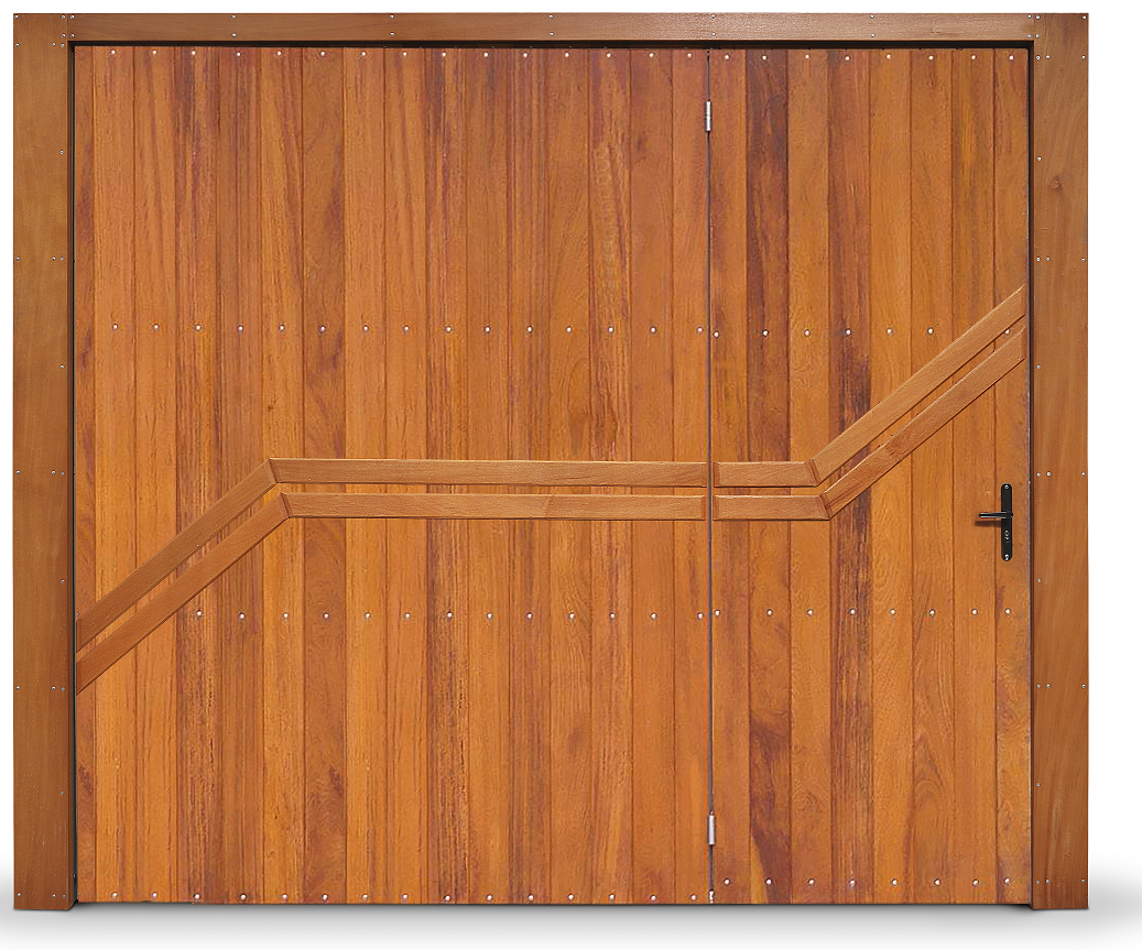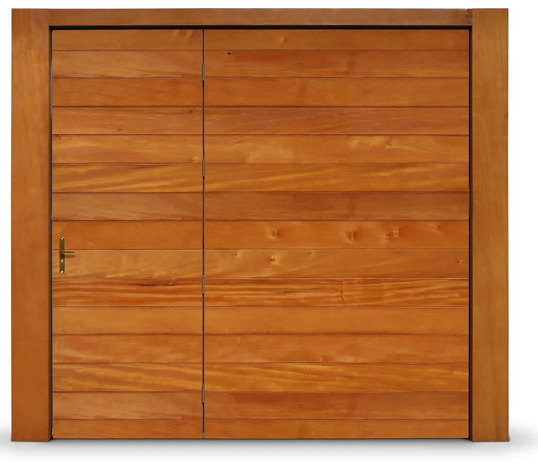 Portão Contrapeso Galvanizado Revestido em Madeira (Lambri) de Cedro Amazonas, sem/com Porta Auxiliar, Rebitado e com Pintura Verniz.