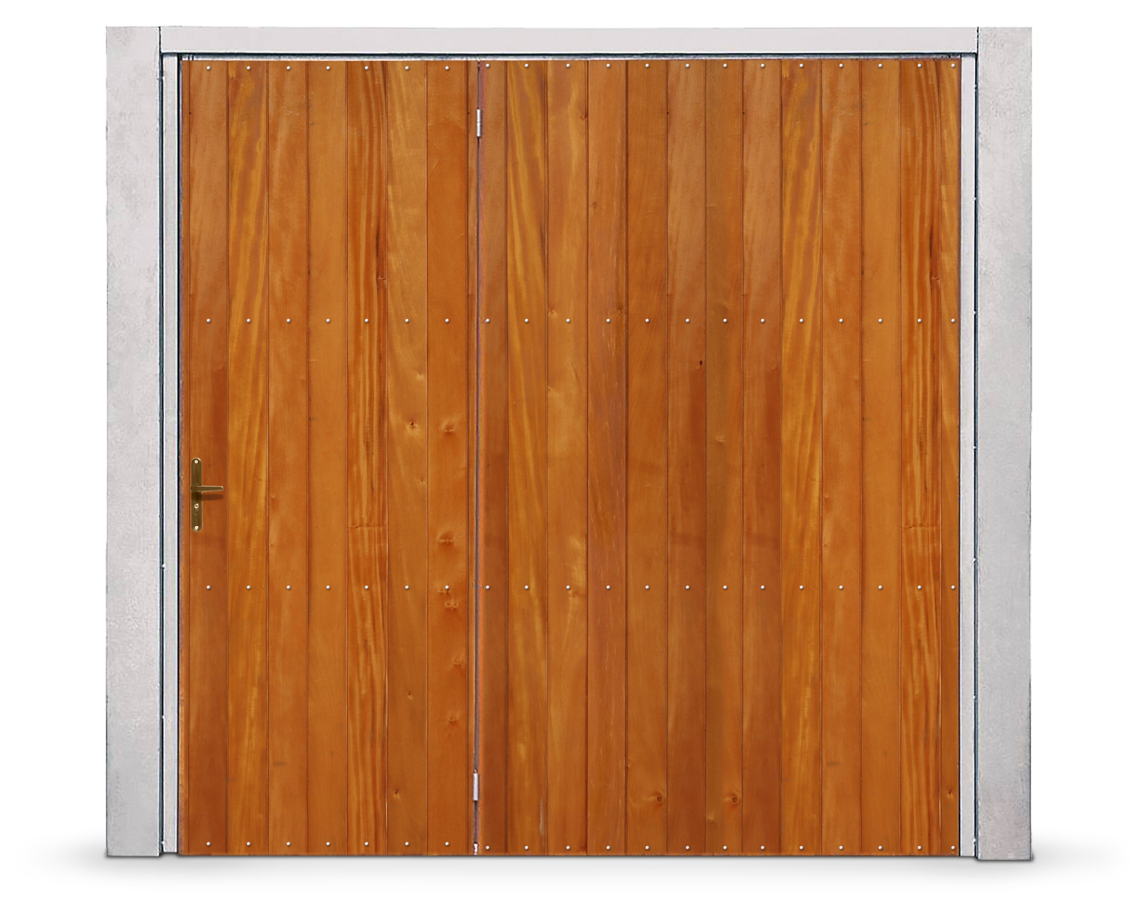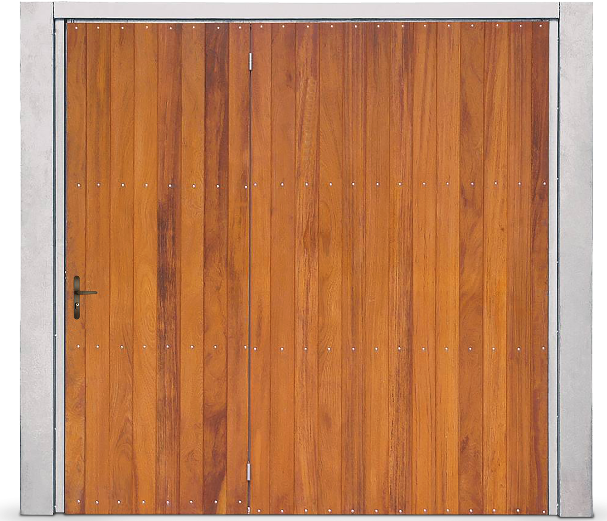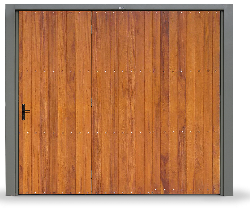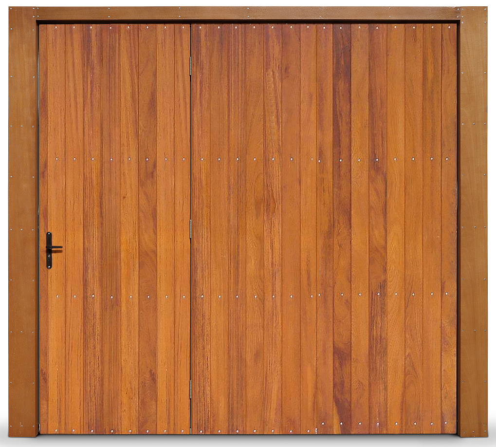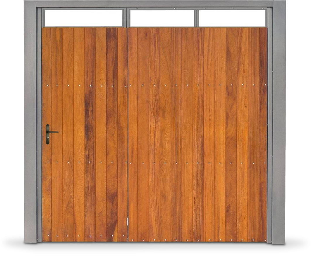 Portão Contrapeso Galvanizado Revestido em Madeira (Lambri) de Cedro Amazonas, sem/com Porta Auxiliar, Rebitado, com Revestimento de Colunas, com Aplique e com Pintura Verniz.