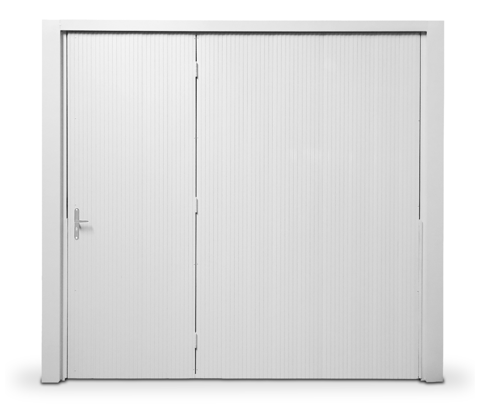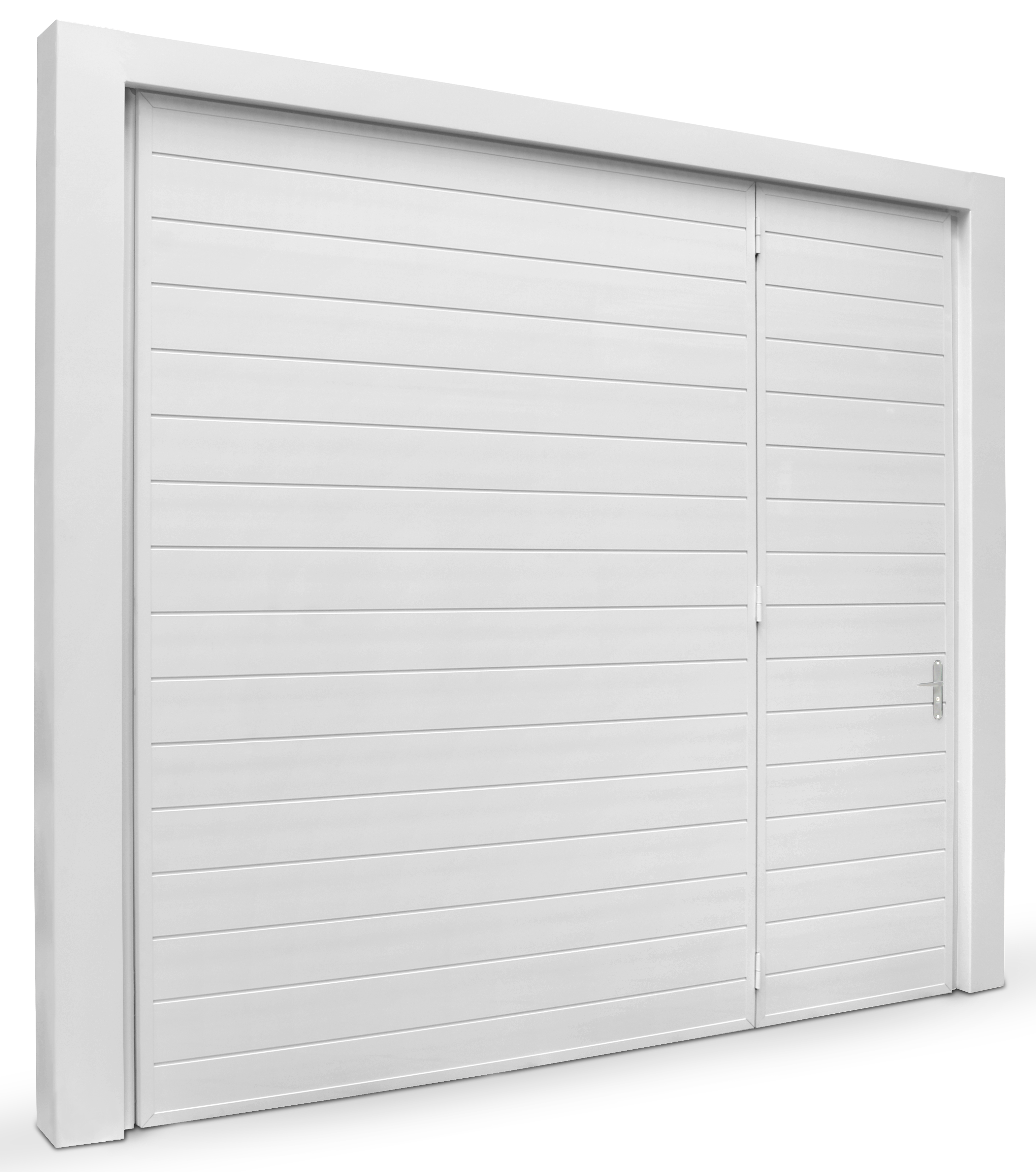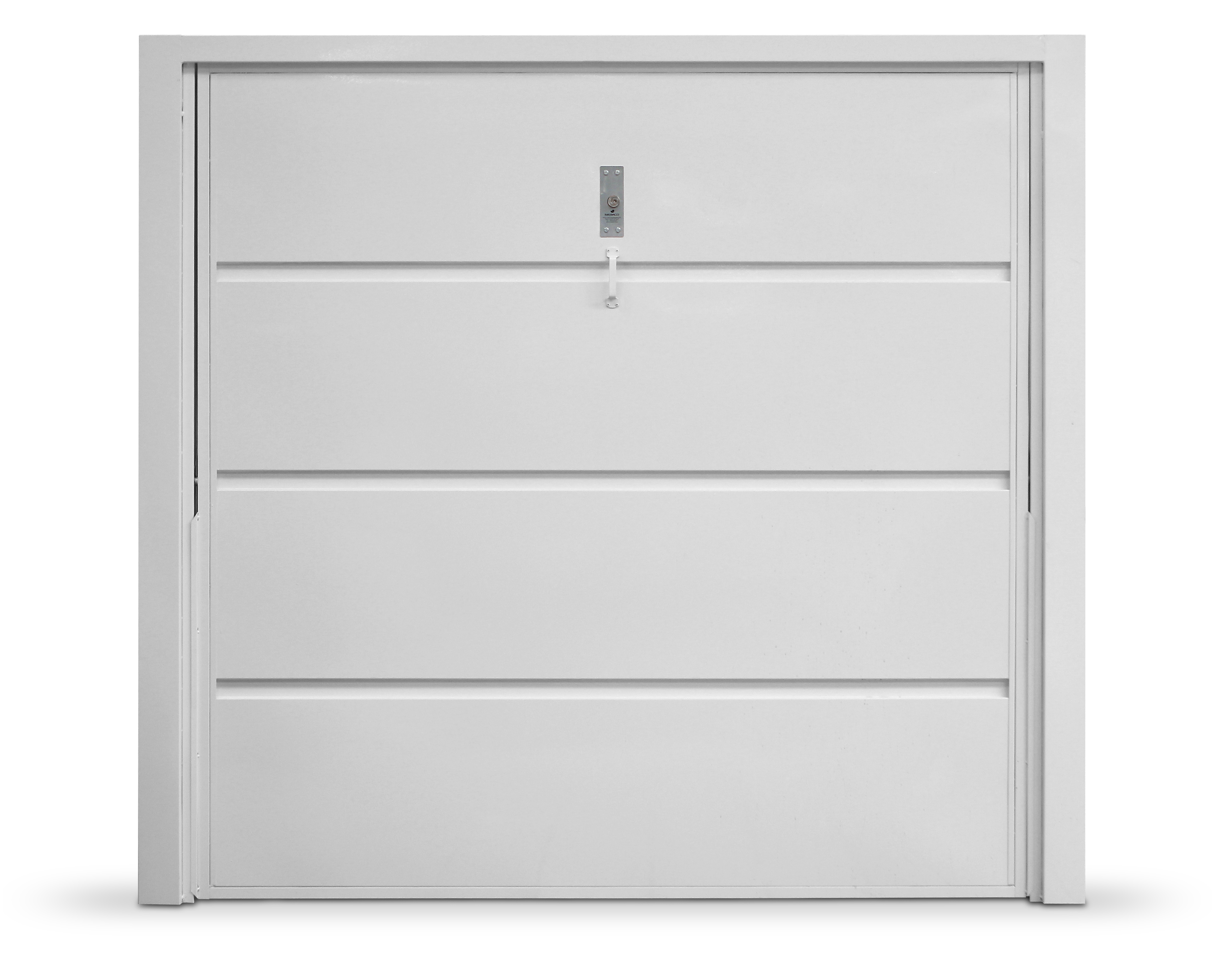 Portão Contrapeso em Chapa Galvanizada 22 (0,80 mm), sem/com Porta Auxiliar, com Negativos, com Pintura Poliester Brilhante Branca e com/sem Fechadura Central.