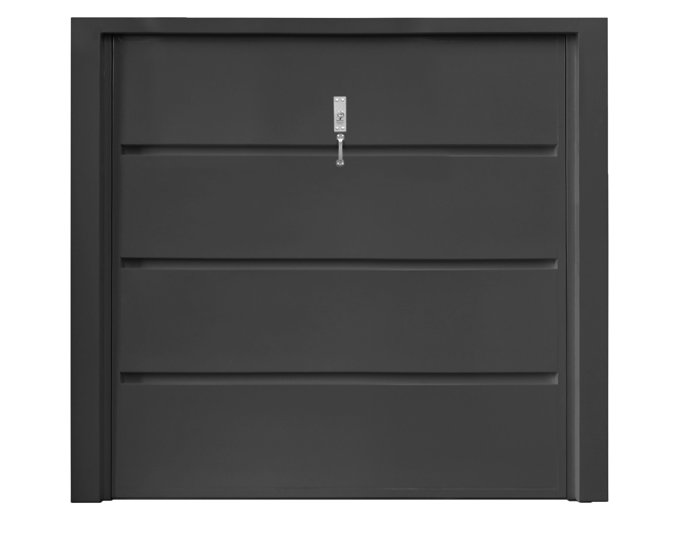 Portão Contrapeso em Chapa Galvanizada 22 (0,80 mm), sem/com Porta Auxiliar, com Negativos, com Pintura Poliester Semi Brilho Preta e com/sem Fechadura Central.